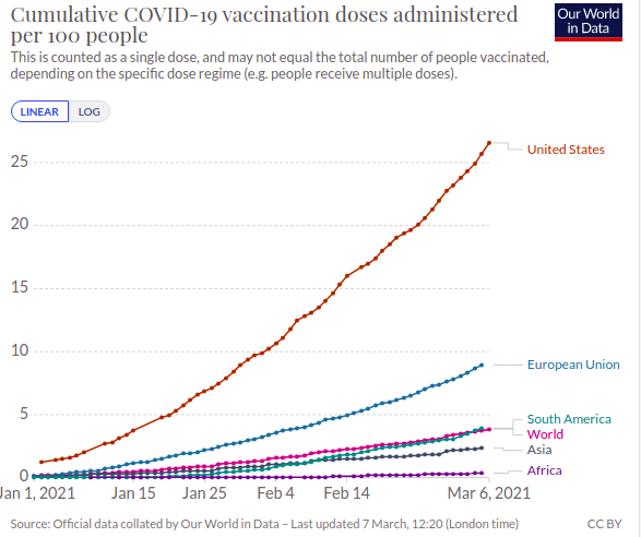 A 7 de março de 2021, de acordo com dados disponíveis em Our World in Data, 2,28% da população mundial havia sido vacinada[1]. Nesse ritmo, 70% da população (número considerado pela OMS como necessário para atingir a “imunidade de rebanho” e superar a pandemia) só estaria vacinada com duas doses em janeiro de 2025.