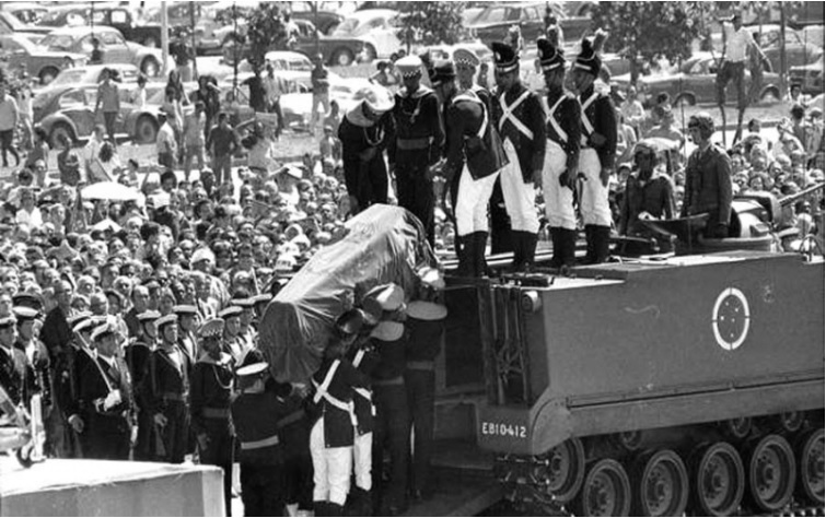 A ficção a ser encenada então seria elogiar e prestar honras ao homem que proclamou a independência ligando sua imagem à das Forças Armadas.